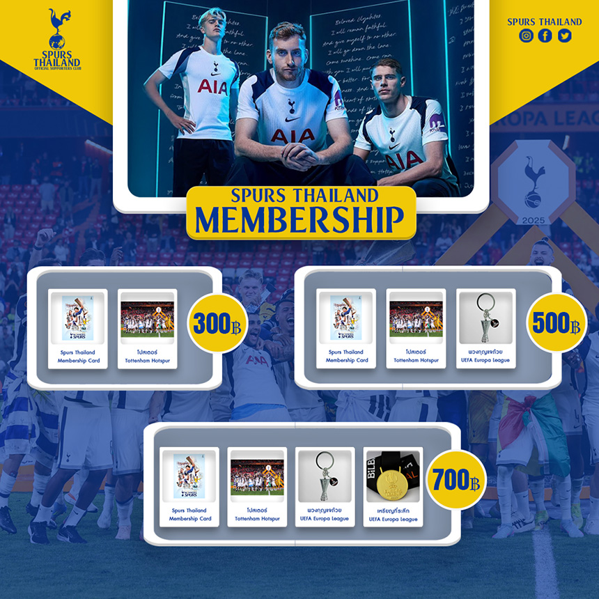 ชุมชนแฟนคลับอย่างเป็นทางการของท็อตแน่ม ฮ็อตสเปอร์ในประเทศไทย พบปะ แลกเปลี่ยน และร่วมเชียร์ทีมรักไปด้วยกัน พร้อมสิทธิพิเศษและกิจกรรมสุดเอ็กซ์คลูซีฟสำหรับสมาชิกเท่านั้น!